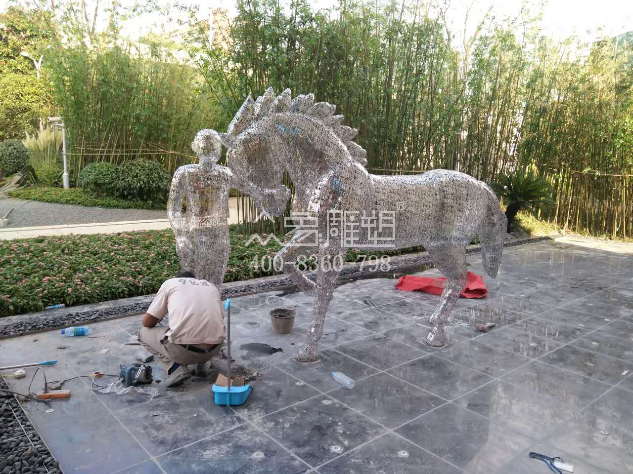 不銹鋼鏡面鏤空馬與人雕塑,由不同字體的家字組成,雕塑美觀現代感強。